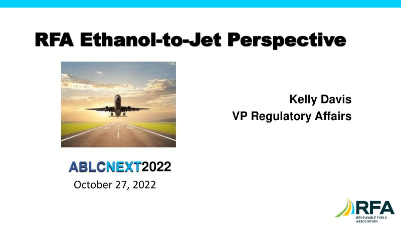 RFA’s view is that SAF production presents a major new market opportunity for ethanol producers, as the lifecycle carbon footprint of ethanol continues to shrink and the economics of ethanol-to-jet fuel processes continue to improve. Ethanol companies recently penned a letter to President Biden, in which they pledged that the ethanol they produce will achieve an average GHG reduction of 70% compared to petroleum by 2030 and a net-zero emission carbon footprint by 2050 or sooner. RFA Vice-President Kelly Davis presented these slides at ABLC Next 2022.