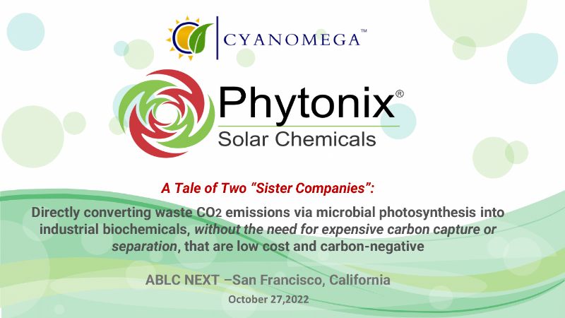 Directly converting waste CO2 emissions via microbial photosynthesis into industrial biochemicals, without the need for expensive carbon capture or separation, that are low cost and carbon-negative. That’s the promise of Phytonix solar chemicals. Company CEO Bruce Dannenberg presented these slides at ABLC Next 2022.