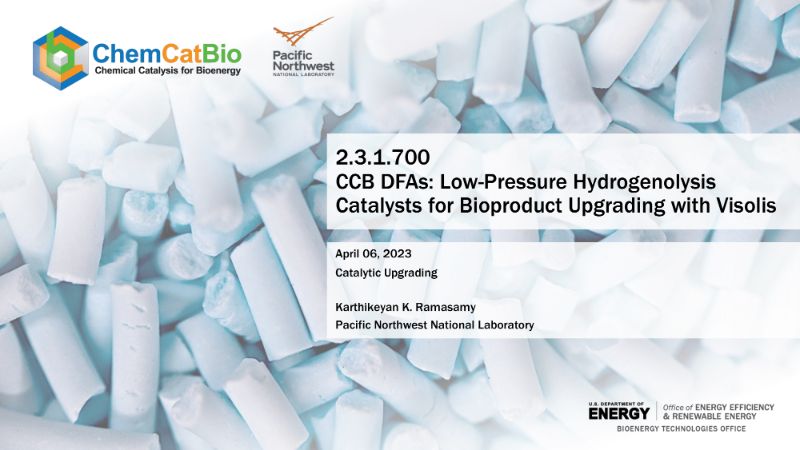 A recent DOE project aims to support Visolis, a biotech start-up company, to develop hydrogenolysis catalyst that can operate at low-pressures (≤ 5 MPa) and demonstrate conversion of a fermentation-derived C6 intermediate to a high value chemical monomer. The target is accelerated catalyst and process development to convert the bio-derived intermediate to a high value monomer, while supporting the start-up company with commercializing their technology. PNNL’s Karthikeyan K. Ramasamy presented these slides at DOE’s Project Peer Review.