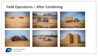 The slides to the left are depicting the Multi-Pass System. Combining (the harvesting of the grain) occurs in both the Multi-Pass and Single Pass Systems. After combining the grain, a shredder cuts and piles the straw or stover into rows, called windrows, for drying and collection. The windrow enables the baling of the material. Next a tractor pulls a baler over the windrow where the baler picks up the material and forms the large square or round bale. Then a bale collector, in this case tractor pulled, collects and field stacks the bales.