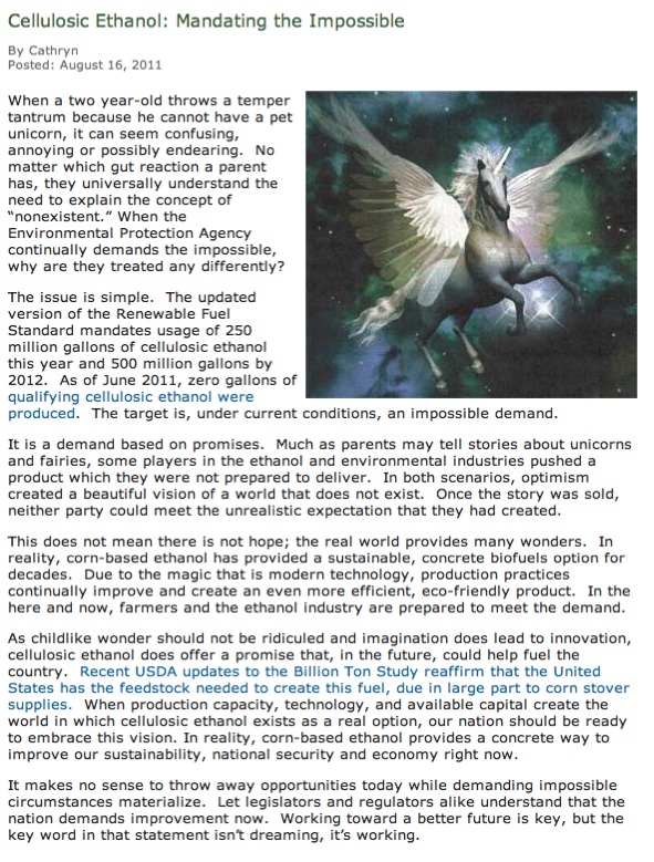 Referring to cellulosic biofuels targets in the Renewable Fuel Standard, she wrote: “Much as parents may tell stories about unicorns and fairies, some players in the ethanol and environmental industries pushed a product which they were not prepared to deliver. In both scenarios, optimism created a beautiful vision of a world that does not exist.”