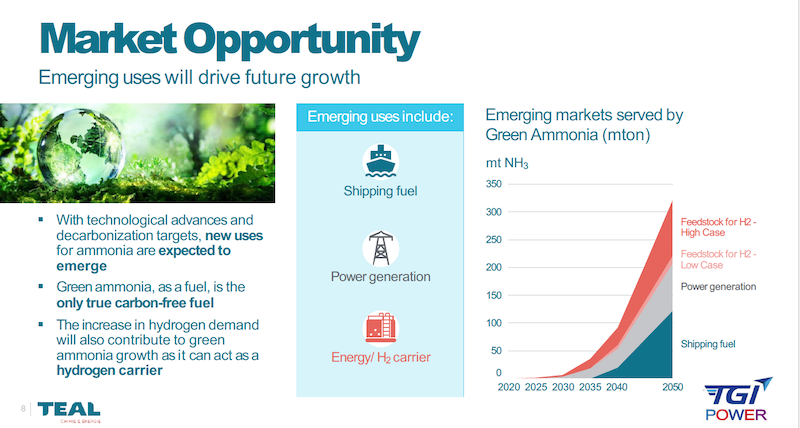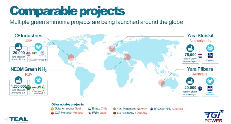 As this slide illustrates, there are many green ammonia projects in development around the world right now. In most cases, they are on the small side, the NEOM project in Saudi Arabia being one on the giant side. Teal and TGI Power are attempting to take scale to the next level.