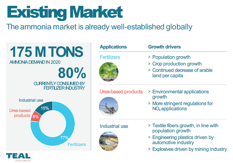 How big is the ammonia market? 175 million tons, this slide says — so, this entry is not for the faint of heart, it’s aiming to capture some 3 percent or so of the world market. Here in Digestville we’d only add that we really don’t know what the demand for ammonia will be until we consider what the demand will be for ammonia as a liquid hydrogen carrier and a storage medium. It’s one heck of a lot easier to run a marine ship on hydrogen fuel cells with liquid ammonia than compressing hydrogen, and more efficient. To give an example.